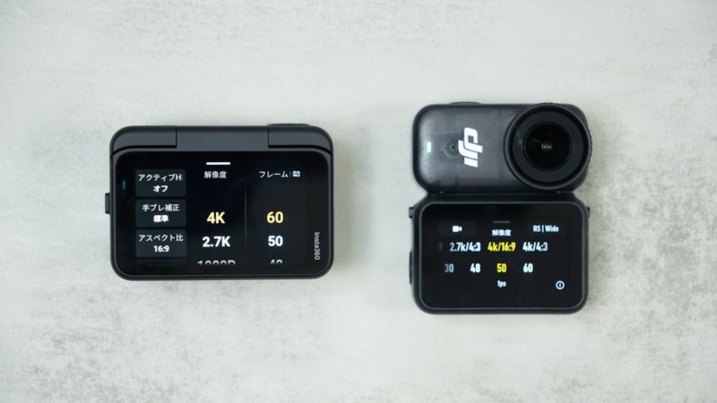 一方のDJI Osmo Nanoは1.96インチのディスプレイですが、反応速度が速く、UIの操作レスポンスも軽快です。設定変更やプレビューを素早く行いたいシーンでは扱いやすい印象です。