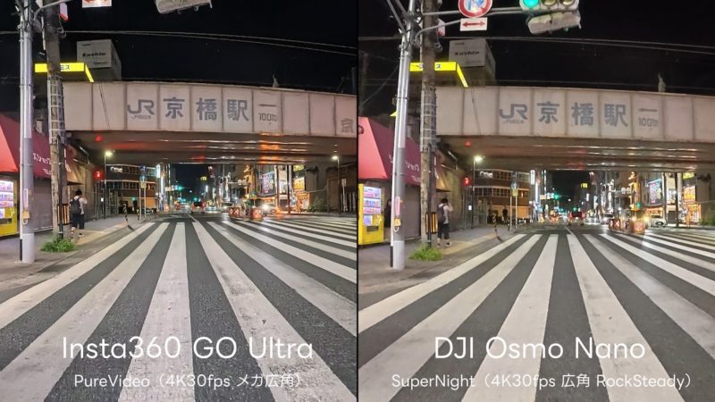 夜間の撮影では、GO Ultraは精細感が高く、暗所でも被写体がはっきり映ります。一方、Osmo Nanoは全体を明るめに映す傾向があり、暗部の見やすさが特徴です。夜景をくっきり撮りたいならGO Ultra、雰囲気を重視したいならOsmo Nanoが向いています。