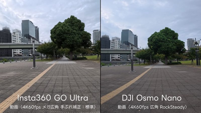 GO Ultraはわずかに画角が狭くなりますが、精細感は維持。Osmo Nanoは4K60fpsでも比較的広い画角を保てるため、広範囲を撮りたいVlog撮影では有利です。