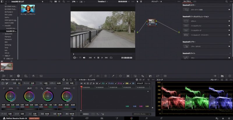 - DaVinci Resolveに読み込み、カット編集等をして、公式LUTを適用してカラーグレーディング